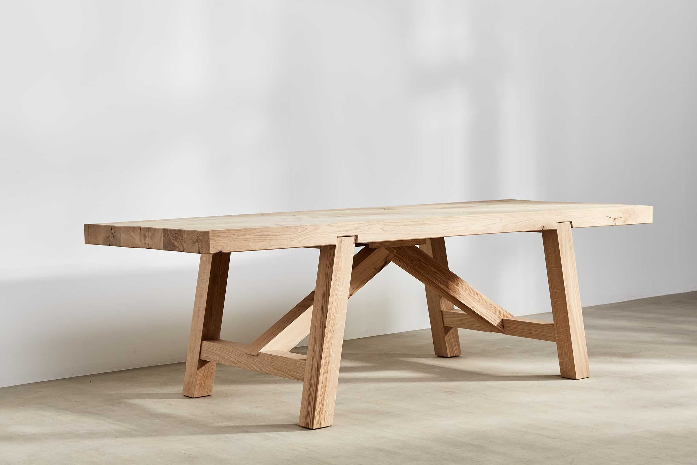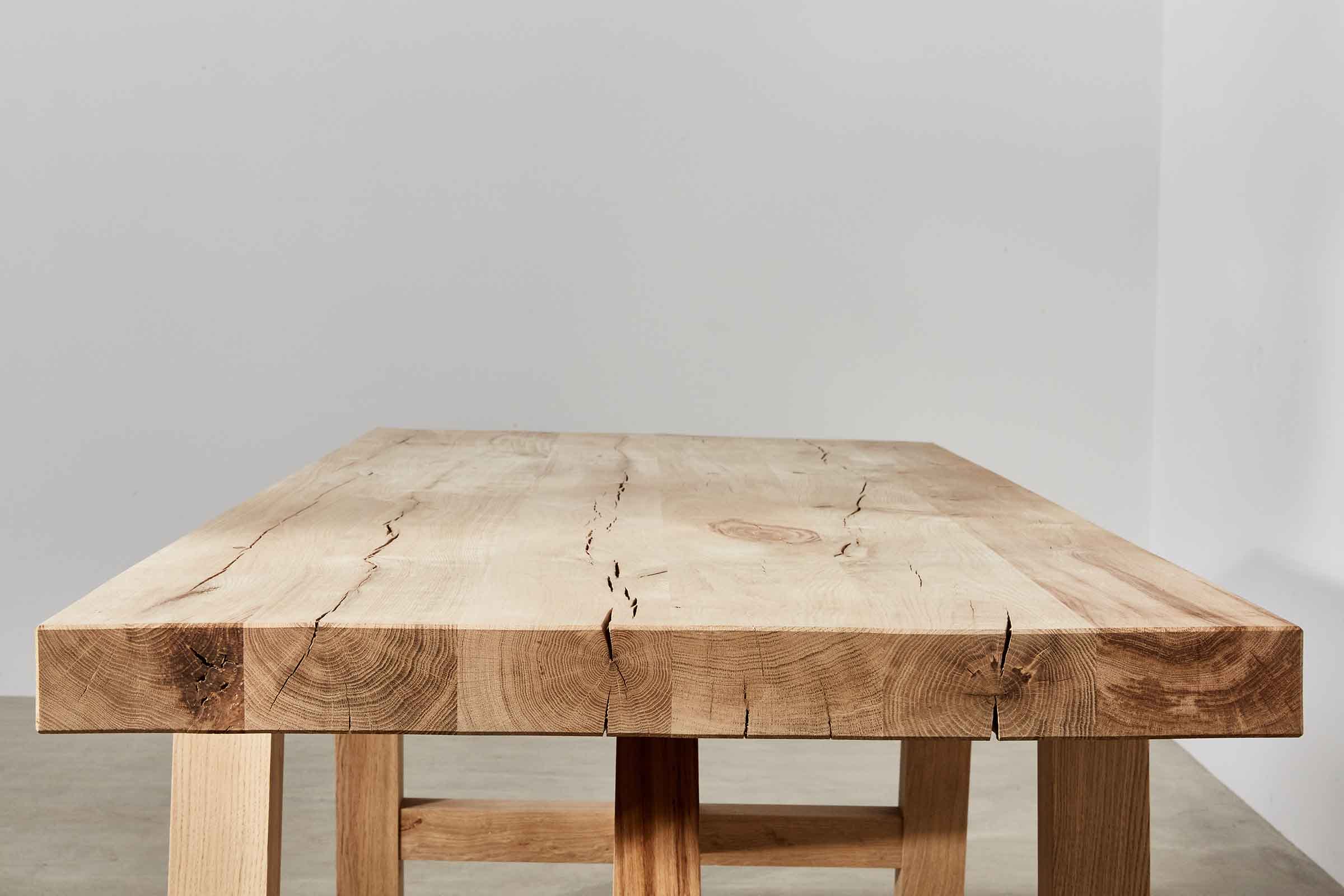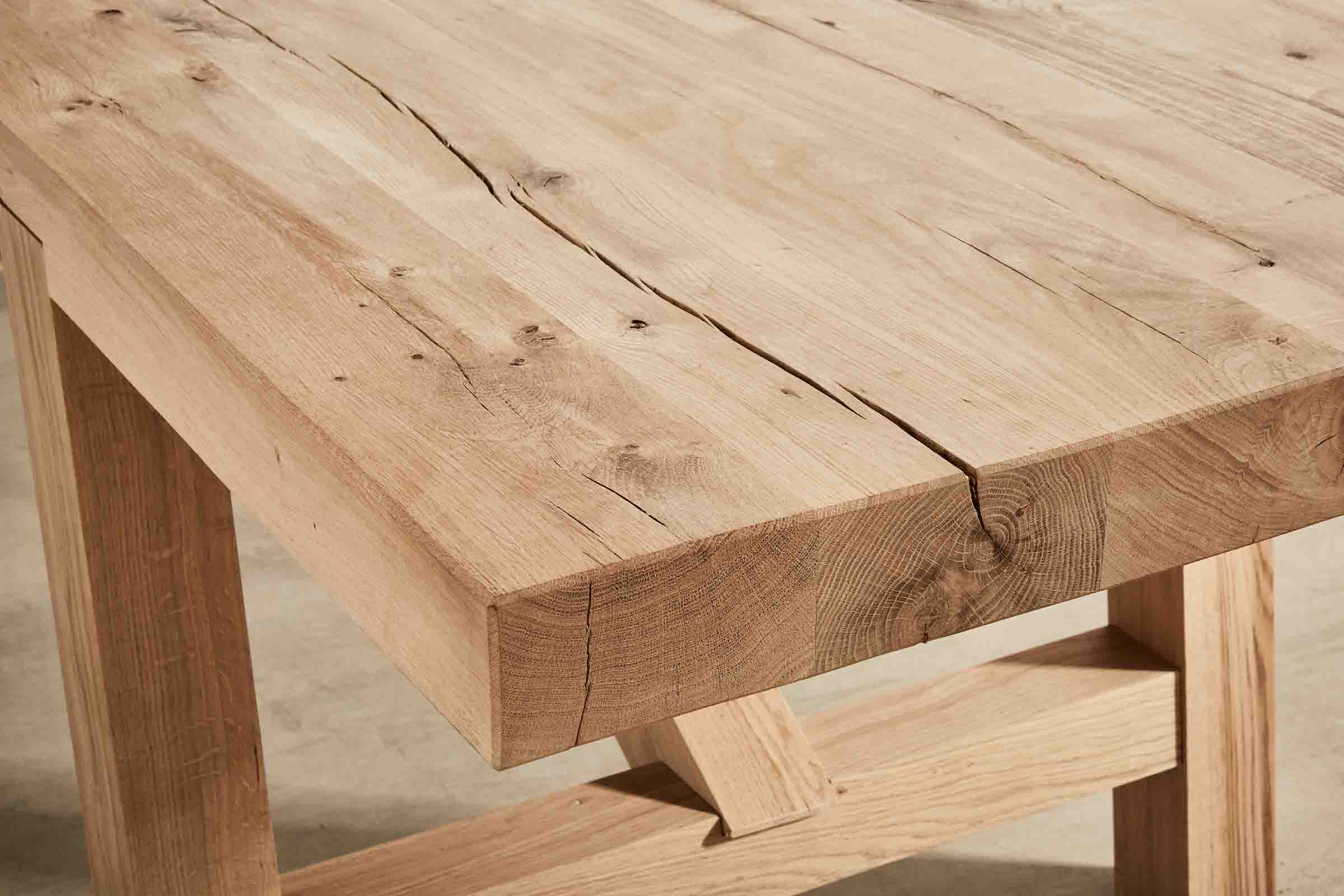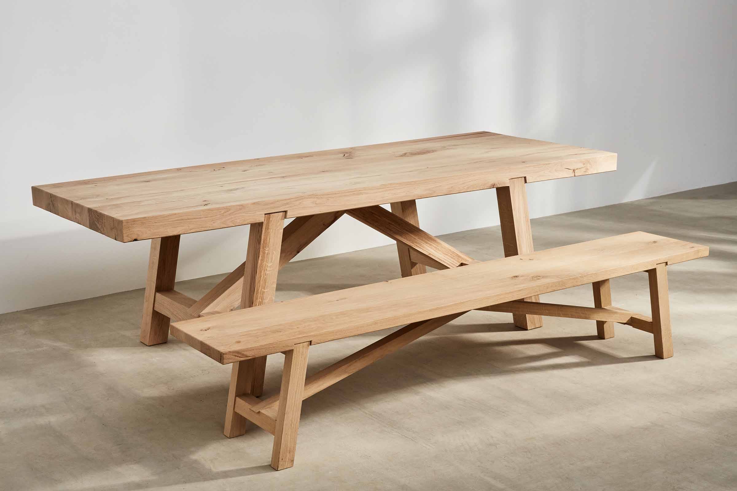 Our outdoor Oscar Table and Bench was specified for the courtyard. We also make it for indoors. Made from air-dried oak, it will continue to move and crack for up to five years as it dries out. We’ve designed this in mind, with joints that move as the timber moves.