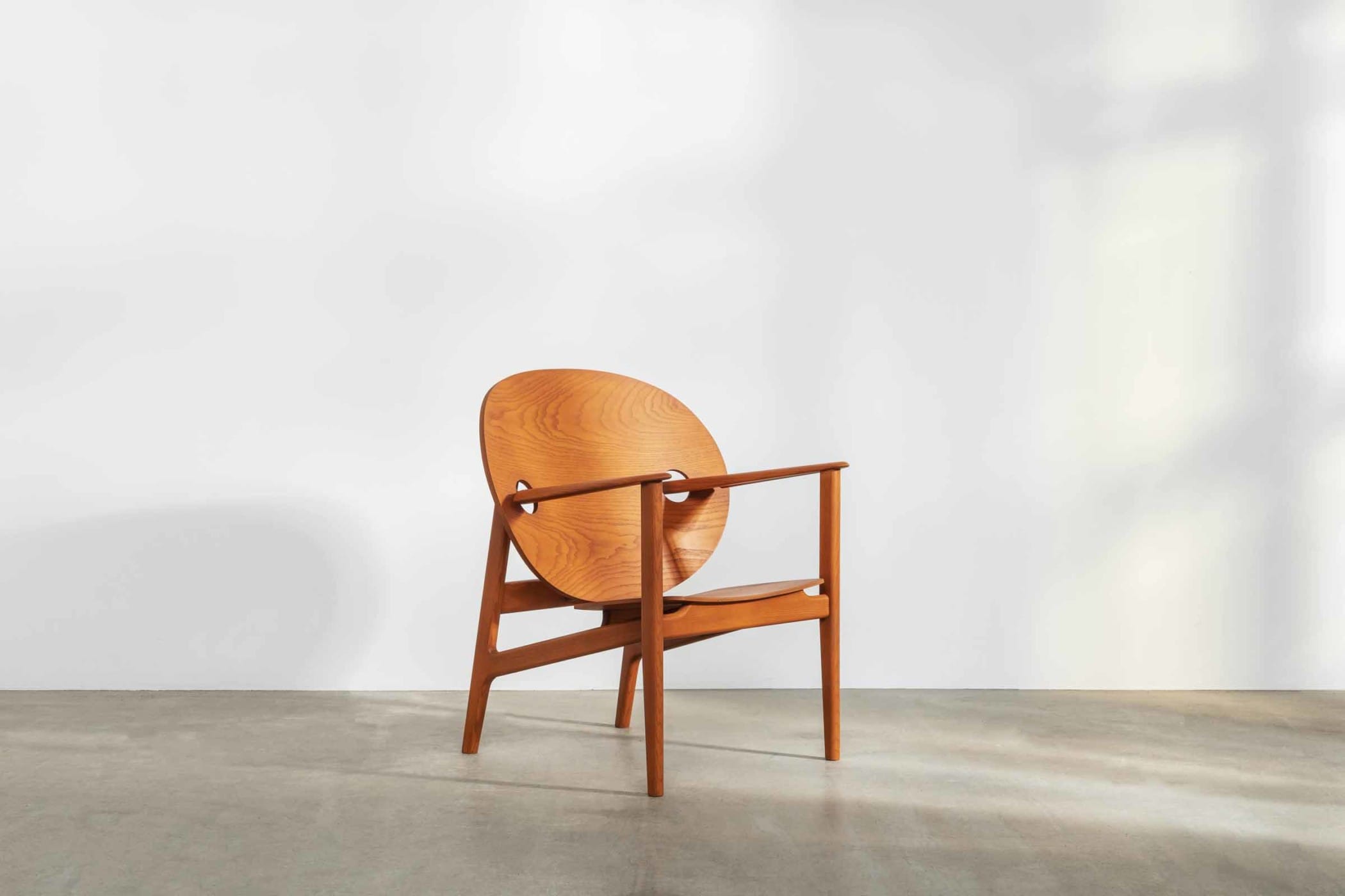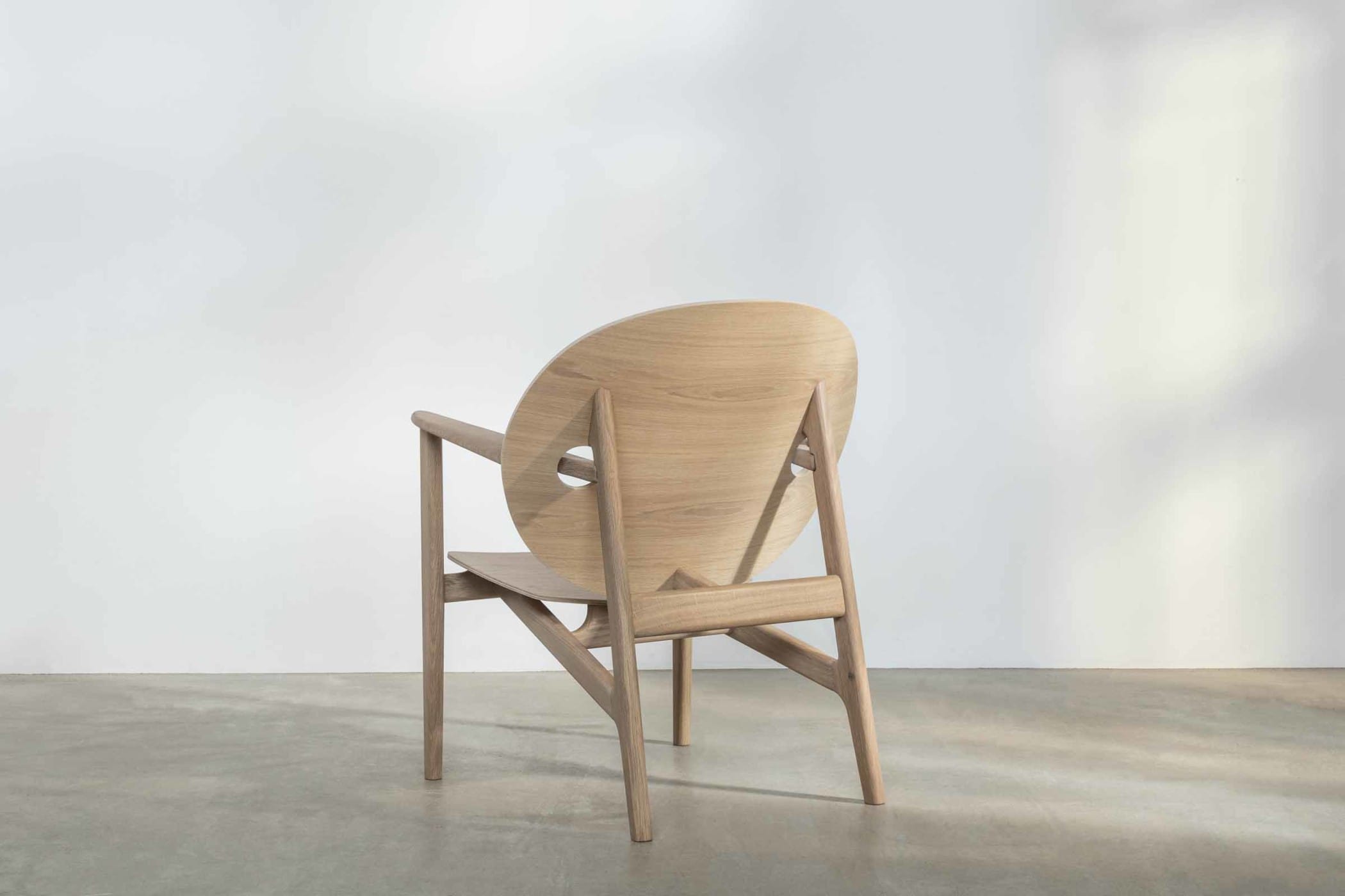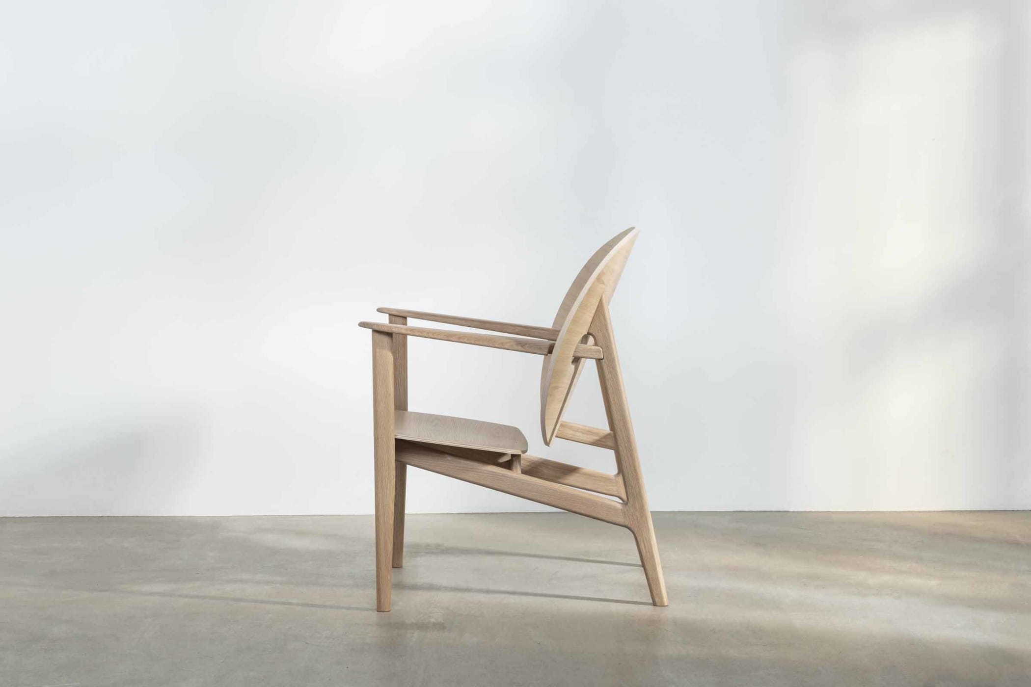 The Iklwa Lounge Chair is part of the Iklwa collection. Each comprised of powerful, spear-like forms, the collection also includes a large throne-like chair and side table crafted in ash and oak, available in either an Earth Orange stain or classic whitened oil.